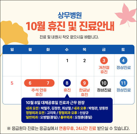 10월 8일(수) -대체공휴일 : 내과, 정형외과, 일반외과, 흉부외과 진료(09:00~17:30) 외 휴진